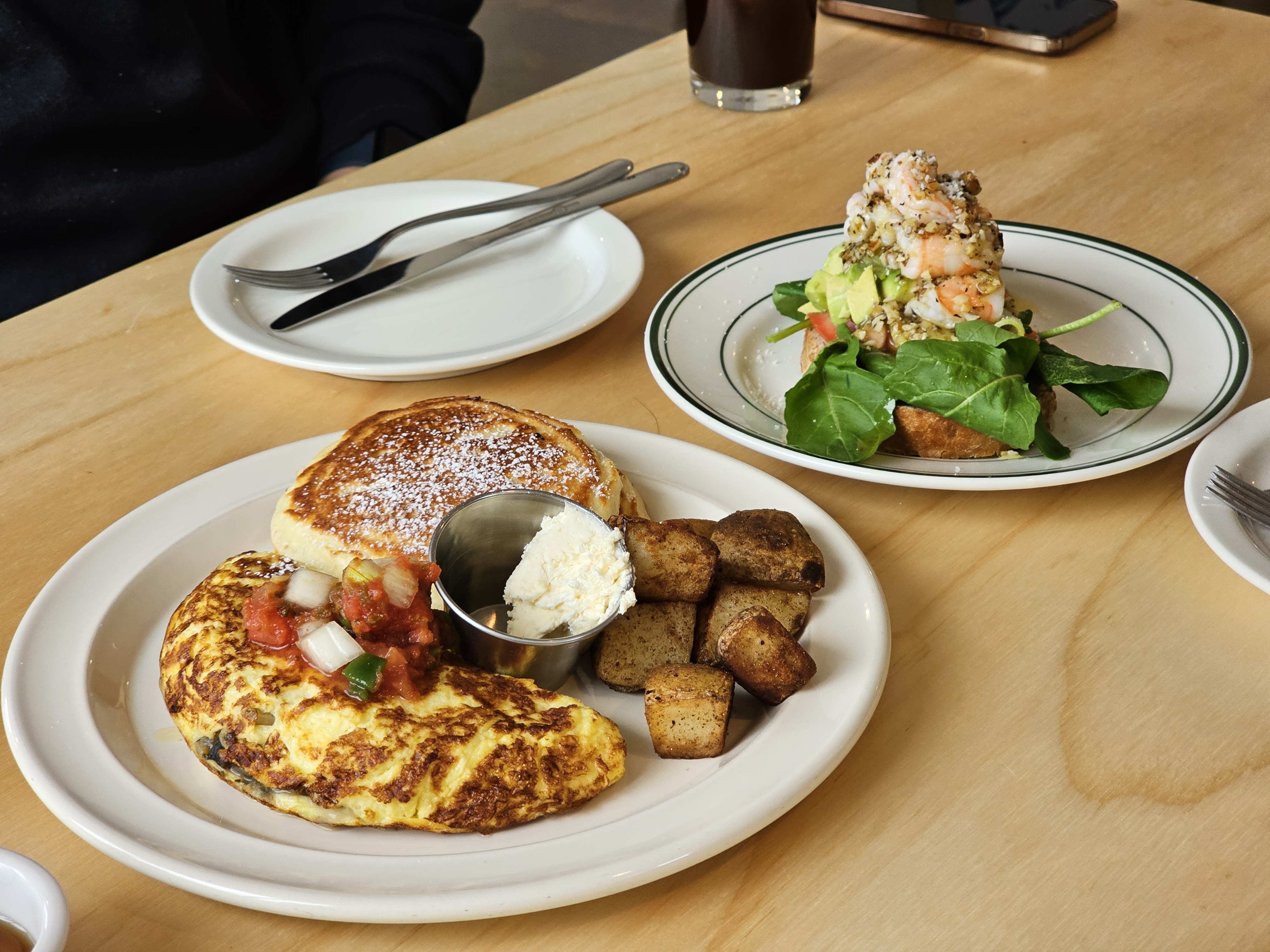 새우 아보카도 오픈 샌드위치, 햄치즈 오믈렛, 수플레 팬케이크 이렇게 3가지 메뉴와 커피 3잔을 시켰습니다.