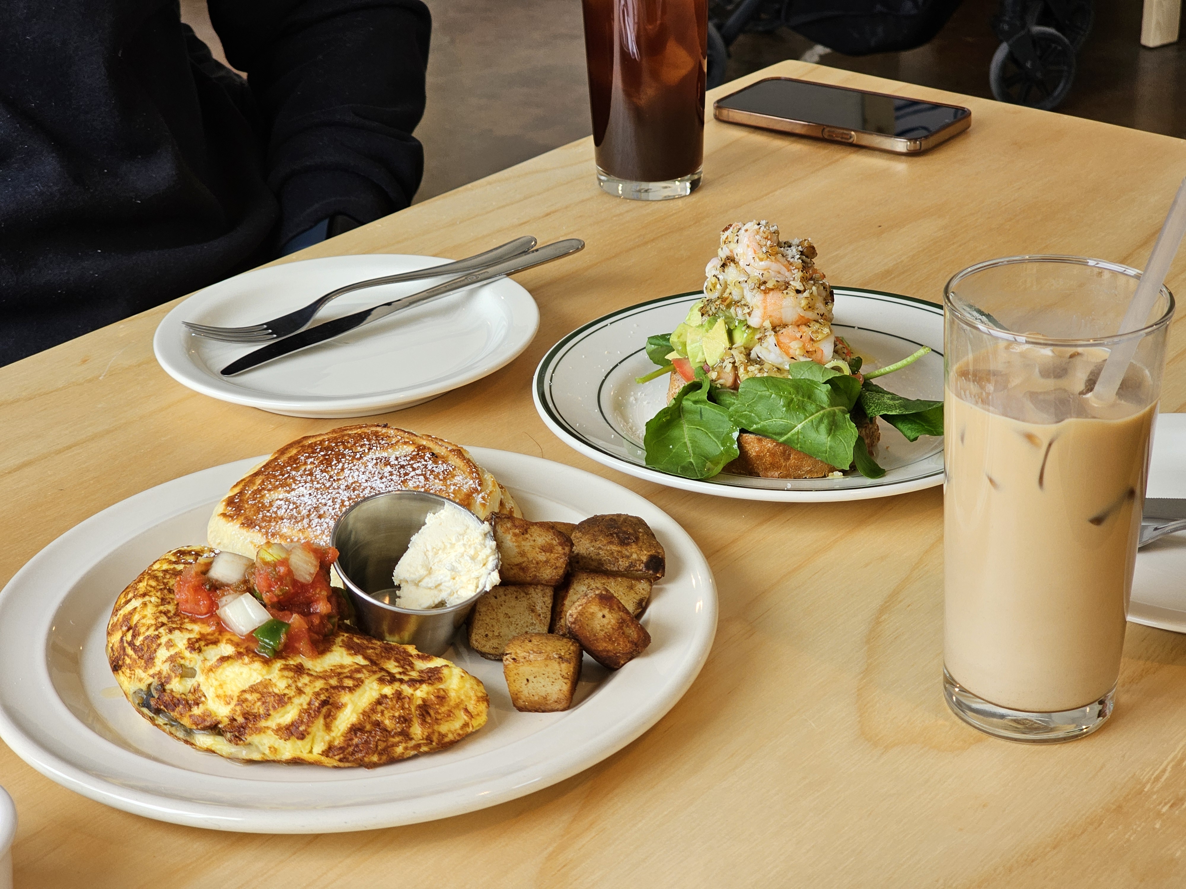 새우 아보카도 오픈 샌드위치, 햄치즈 오믈렛, 수플레 팬케이크 이렇게 3가지 메뉴와 커피 3잔을 시켰습니다.